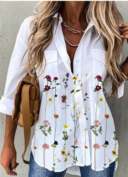 Women's Long Sleeve Shirt Spring/Fall As Picture Floral Buckle Shirt Collar Daily Going Out Casual Top