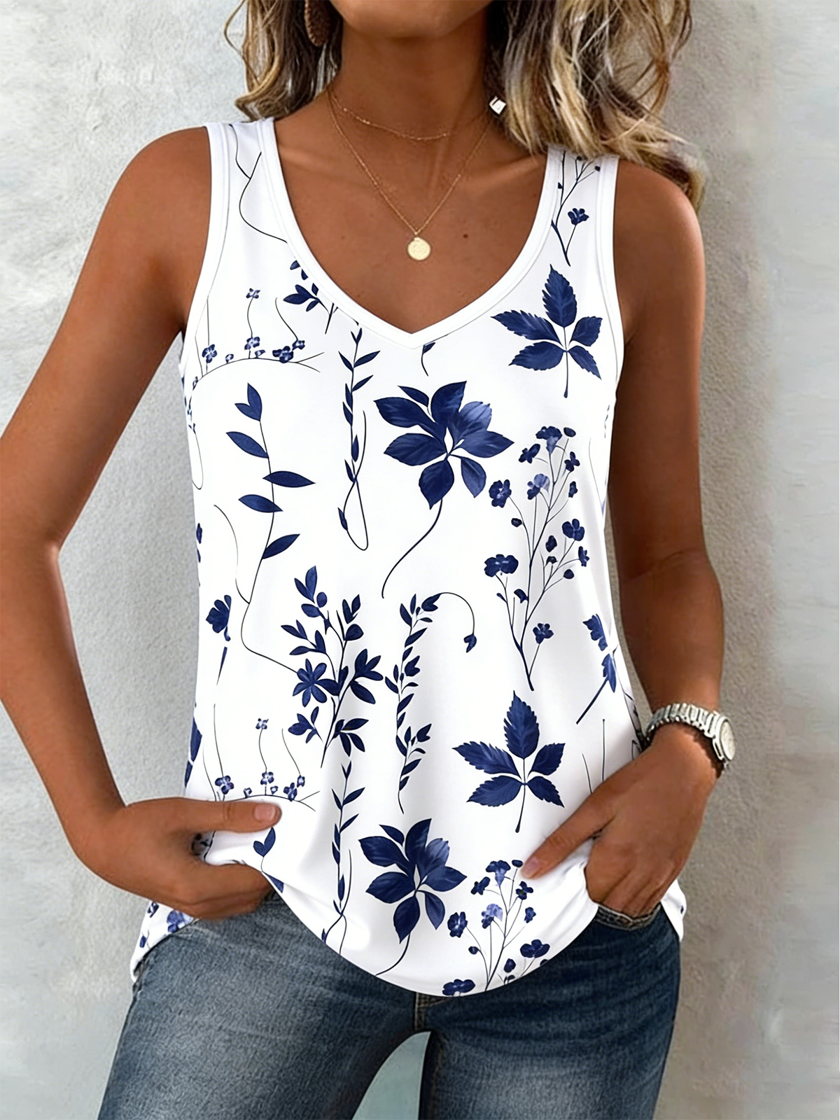 Women Floral V Neck Cotton-Blend Sleeveless Casual Daily Summer Tank Top