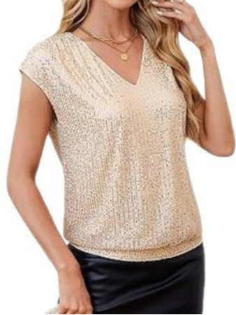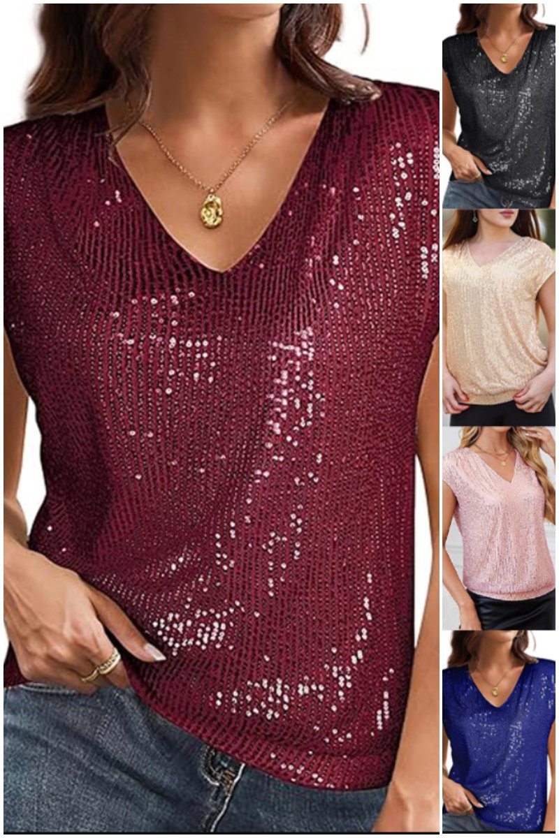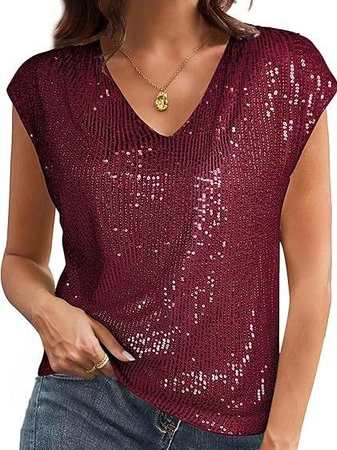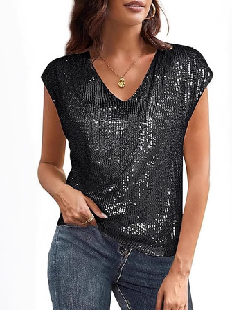 Women's Short Sleeve Sequins T-shirt Summer Wine Red Plain V Neck Party Going Out Casual Top