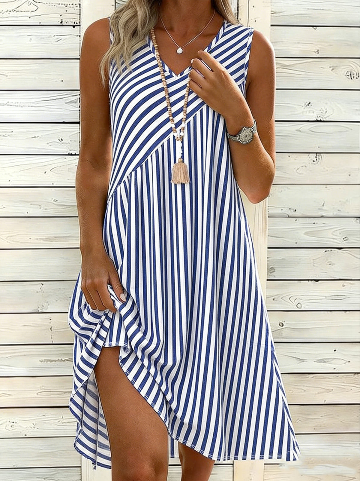 Women Striped Cotton V Neck Tank Casual Summer Daily Midi A-Line Dress