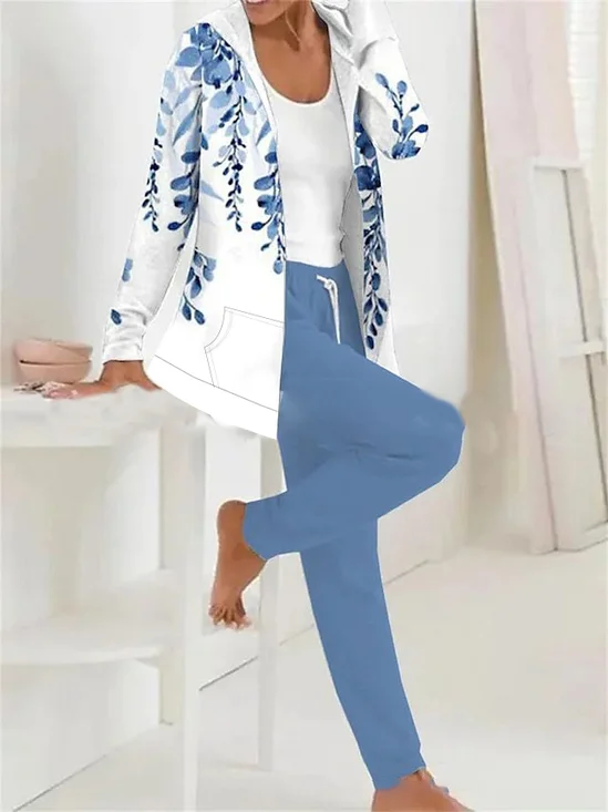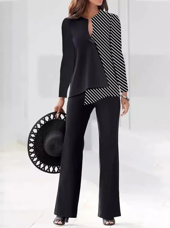 Women Plain Long Sleeve Top With Pants Casual Spring/Fall Half Open Collar Two-Piece Set