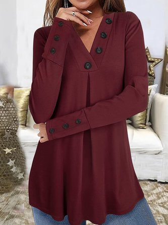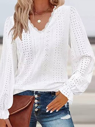 Women Plain V Neck Cotton Long Sleeve Casual Daily Spring/Fall Shirt