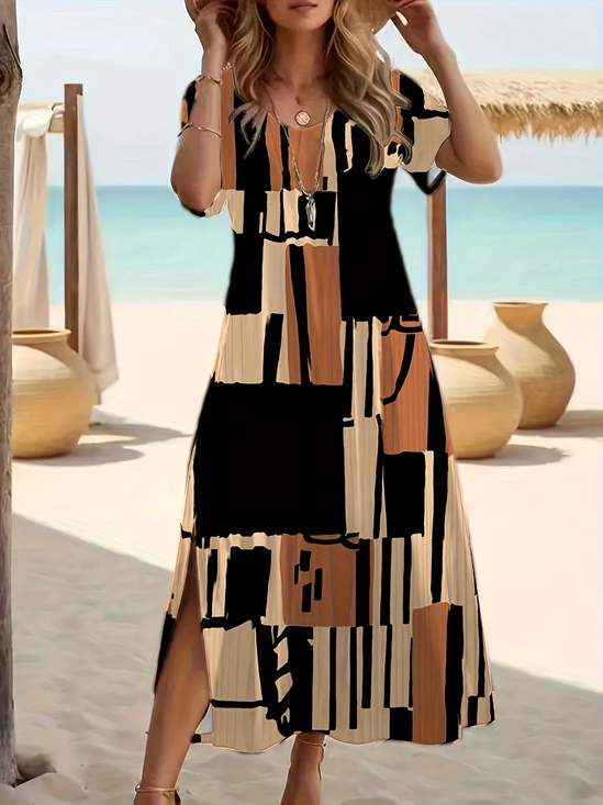 Women Striped Crew Neck Printing Hip Skirt Vintage Spring/Fall Daily Mini A-Line Dress