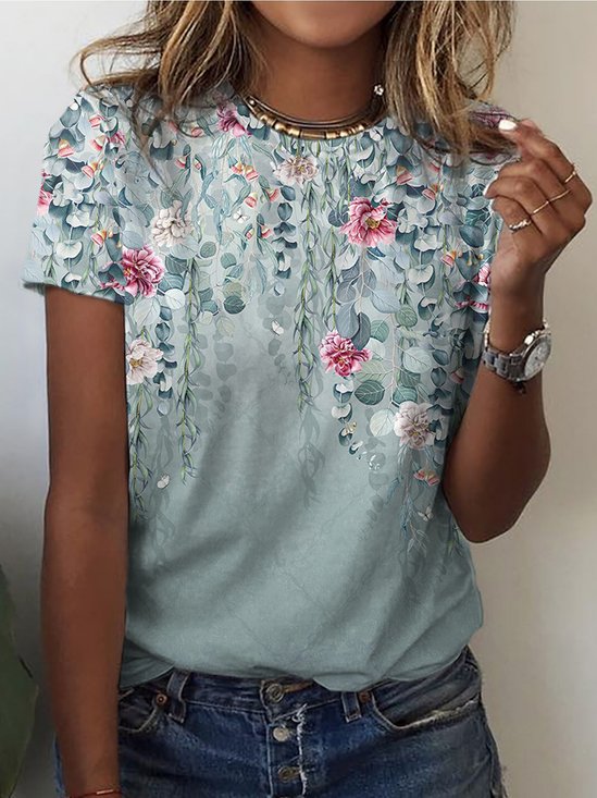 Women's Long Sleeve T-shirt Spring/Fall Green Floral Printing Jersey Crew Neck Daily Going Out Casual Tunic T-Shirt