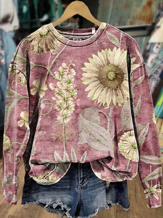 Women Floral Crew Neck Cotton Long Sleeve Vintage Holiday Spring/Fall Sweater