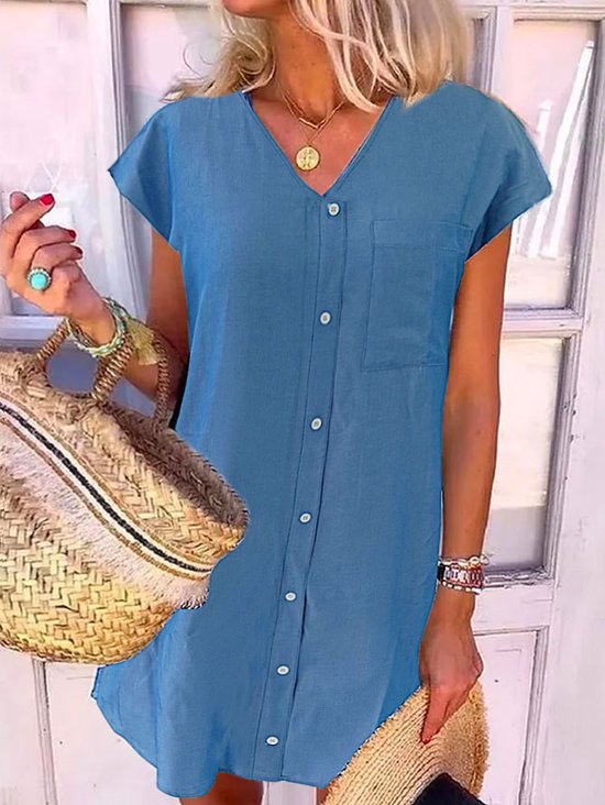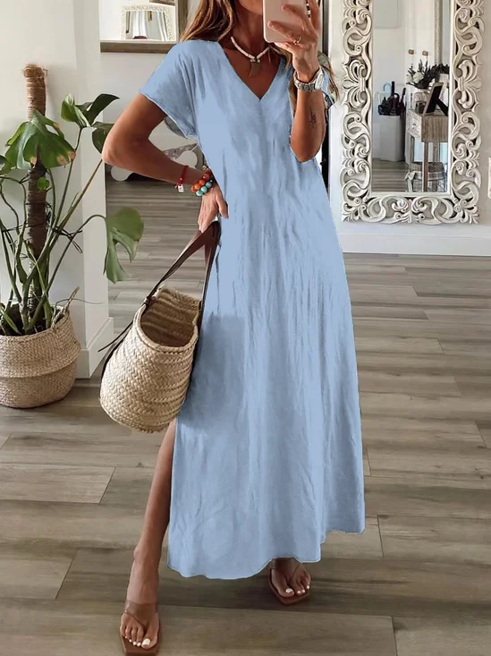 Women's Short Sleeve Summer Aqua Plain Split Joint V Neck Daily Going Out Vintage Maxi A-Line Tank Dress