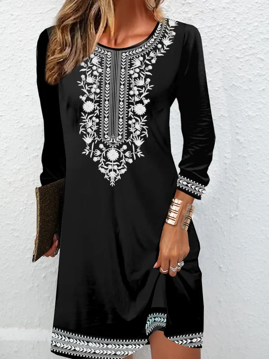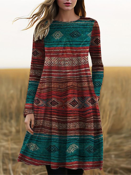 Women Geometric Crew Neck Vintage Summer Vacation Floor Length H-Line Dress