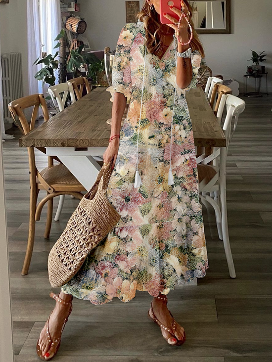 Women Floral Cotton And Linen V Neck Vintage Spring/Fall Party Maxi A-Line Dress