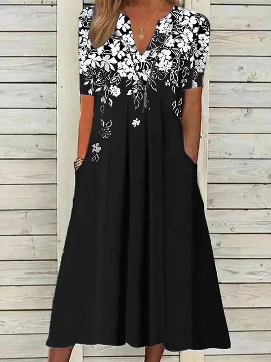 Women's Short Sleeve Summer Black Floral Printing V Neck Daily Going Out Casual Midi A-Line Fit & Flare Dress Dress