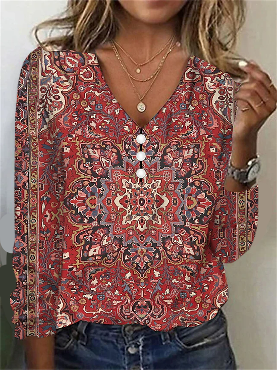 Ethnic Print Long Sleeve V-Neck T-shirt