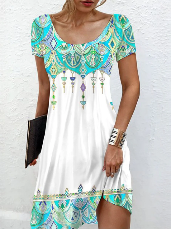 Women Geometric Crew Neck Vintage Summer Vacation Floor Length H-Line Dress