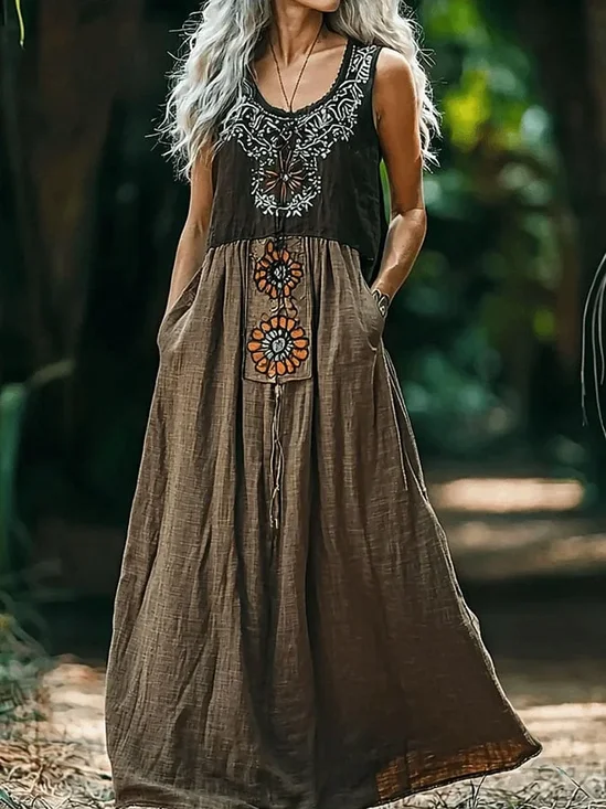 Vintage Cotton-Blend Ethnic Geometry Dress With No