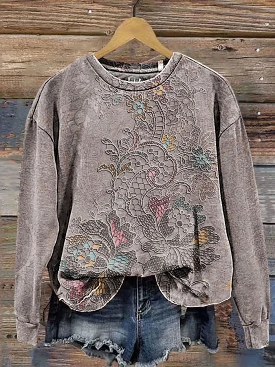 Women Floral Crew Neck Long Sleeve Vintage Daily Spring/Fall Sweatshirt