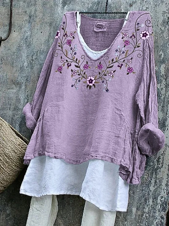 Women Floral V Neck Cotton-Blend Long Sleeve Casual Daily Spring/Fall Blouse