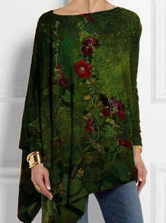 Women's Long Sleeve T-shirt Spring/Fall Green Floral Printing Jersey Crew Neck Daily Going Out Casual Tunic T-Shirt