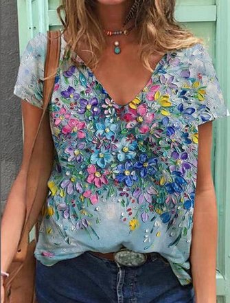 Women Floral V Neck Three Quarter Sleeve Casual Daily Spring/Fall T-shirt