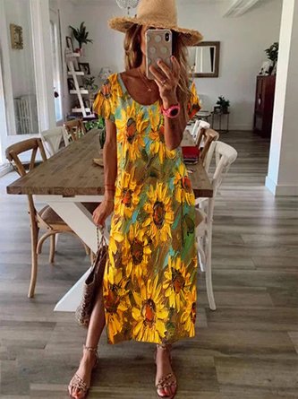 Women Floral Crew Neck T-Shirt Dress Casual Spring/Fall Daily Midi A-Line Dress
