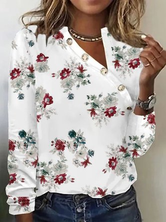 Women Floral V Neck Cotton-Blend Long Sleeve Casual Daily Spring/Fall Blouse