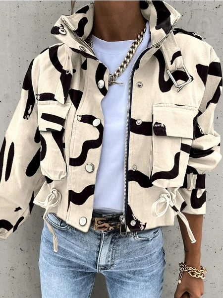 Women Geometric Stand Collar Bomber Jacket Long Sleeve Vintage Printing Spring/Fall Daily Jacket Outerwear