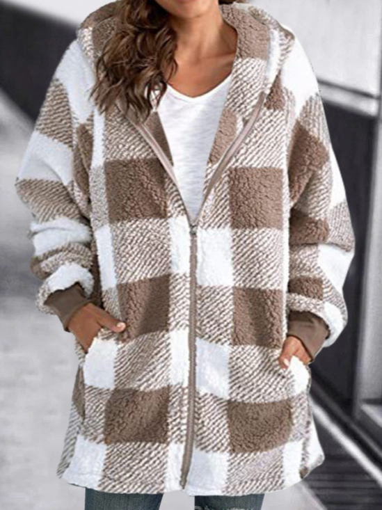 Women Plaid Hooded Zip Up Hoodie Long Sleeve Vintage Split Joint Spring/Fall Daily Jacket Outerwear
