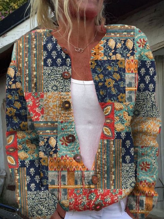 Women Geometric Mock Neck Long Sleeve Vintage Embossed Spring/Fall Daily Blazer Outerwear