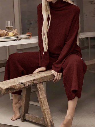 Women Plain Long Sleeve Top With Pants Casual Split Joint Spring/Fall Turtleneck Two-Piece Set