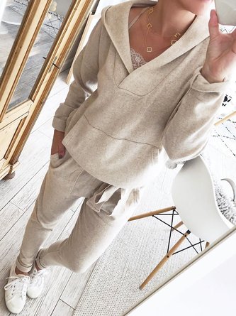 Women Plain Long Sleeve Top With Pants Casual Split Joint Spring/Fall Hoodie Two-Piece Set