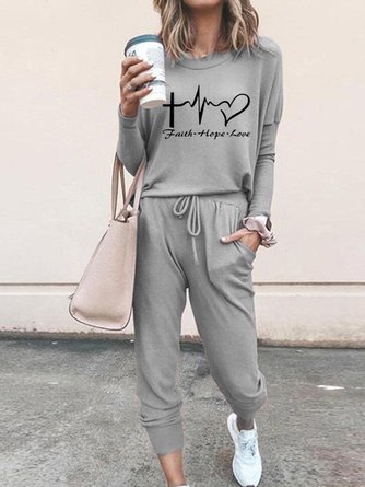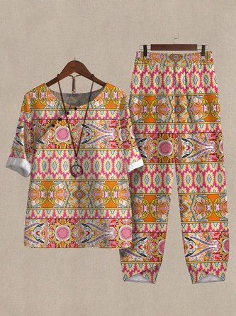 Women Abstract Jersey Long Sleeve Top With Pants Casual Printing Spring/Fall Crew Neck Two-Piece Set