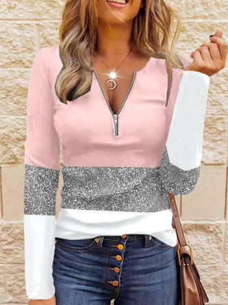 Women Plain Stand Collar Long Sleeve Casual Daily Spring/Fall T-shirt