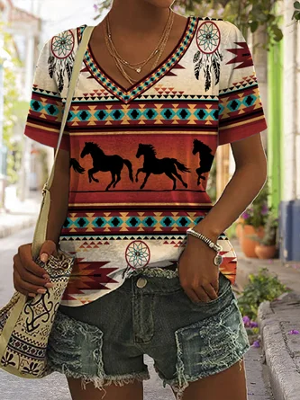 Women Dog V Neck Cotton-Blend Short Sleeve Vintage Holiday Summer T-shirt