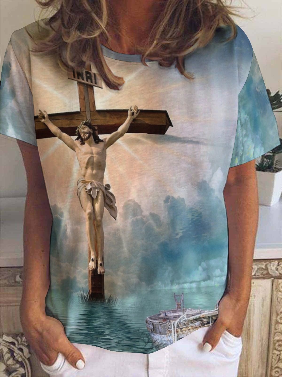 Jesus Print Casual Short Sleeve Top