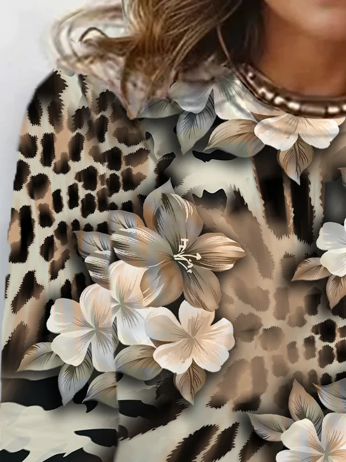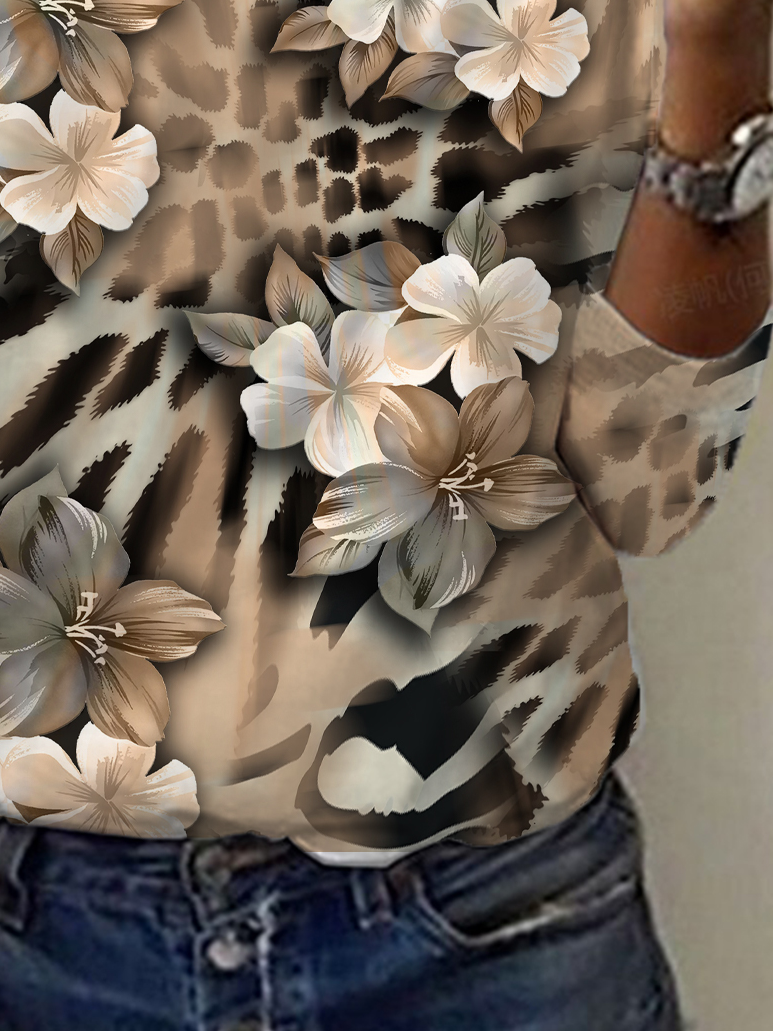 Leopard Floral Print Long Sleeve Crew Neck T-shirt