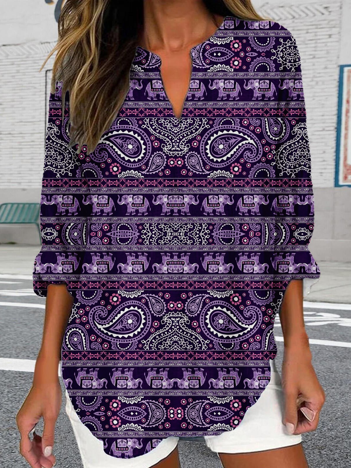 Women's cotton and linen casual paisley print V-neck long-sleeved shirt