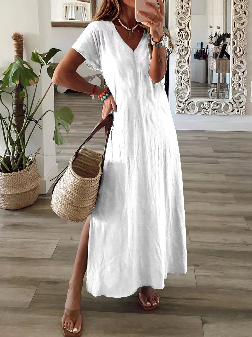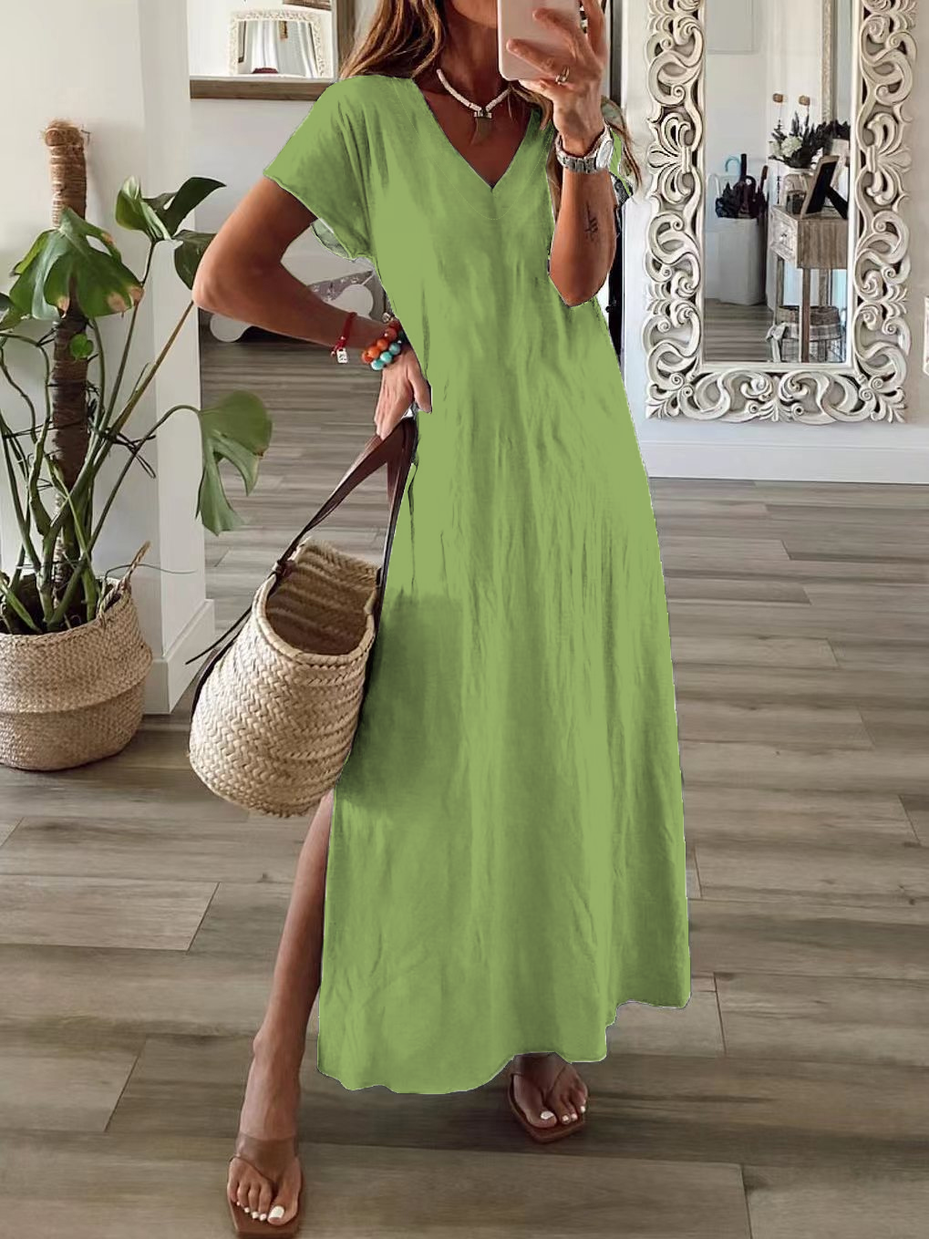 Women's Spring Printed Casual V-Neck Short Sleeve Slit Dress